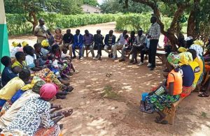 One day the chief of the people was walking with his dog, looking for mushrooms and roots to satisfy the hunger of his family. As he strolled along he saw a white and shining stone, which he picked up and thoughtlessly threw for his dog to retrieve. The dog bounded after the stone. The white stone rolled into the compound of the witches who were invisible by day. The dog followed after it and ran into the witches’ compound looking for the white stone, and seeing the glowing fire tied around the neck of the witch, mistook it for the stone. She snatched it from the sleeping witch’s neck and streaked back home to her master.